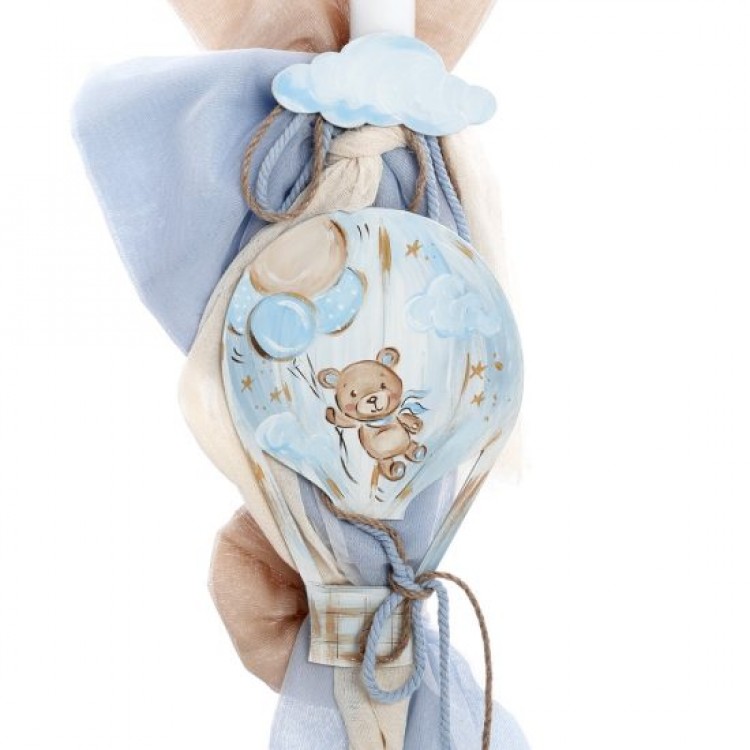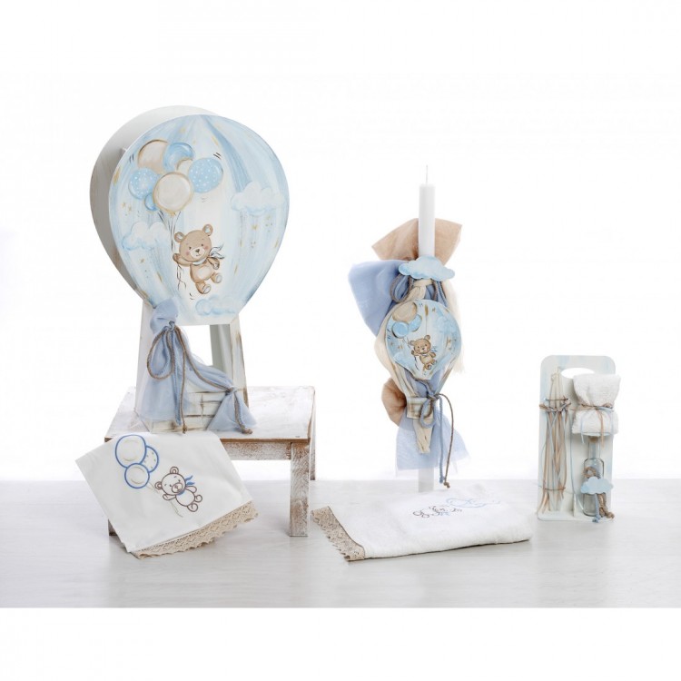 Ολοκληρωμένο βαπτιστικό σετ με θέμα το Αρκουδάκι σε Αερόστατο, διακοσμημένο με χειροποίητη ζωγραφική, σε γαλάζιες και μπεζ αποχρώσεις. Ένα ρομαντικό και ονειρικό σετ για μια ξεχωριστή βάπτιση.