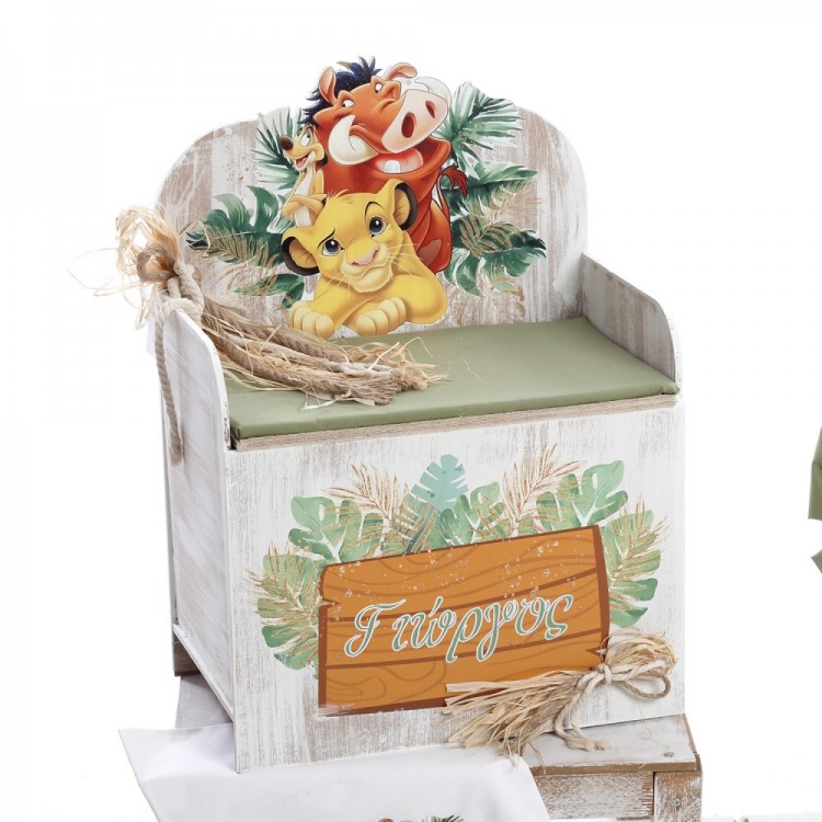 Ολοκληρωμένο βαπτιστικό σετ με αγαπημένο θέμα Lion King, διακοσμημένο με υψηλής ποιότητας UV εκτύπωση σε τροπικό στυλ. Ζωντανά χρώματα και χαρούμενα σχέδια ιδανικά για μια ξεχωριστή βάπτιση.