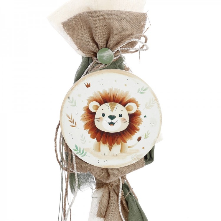✔ Λαμπάδα βάπτισης στολισμένη με ξύλινο διακοσμητικό λιονταράκι, λινά υφάσματα και κορδόνια.