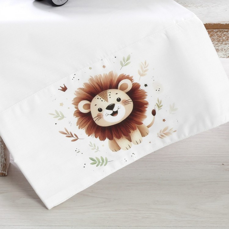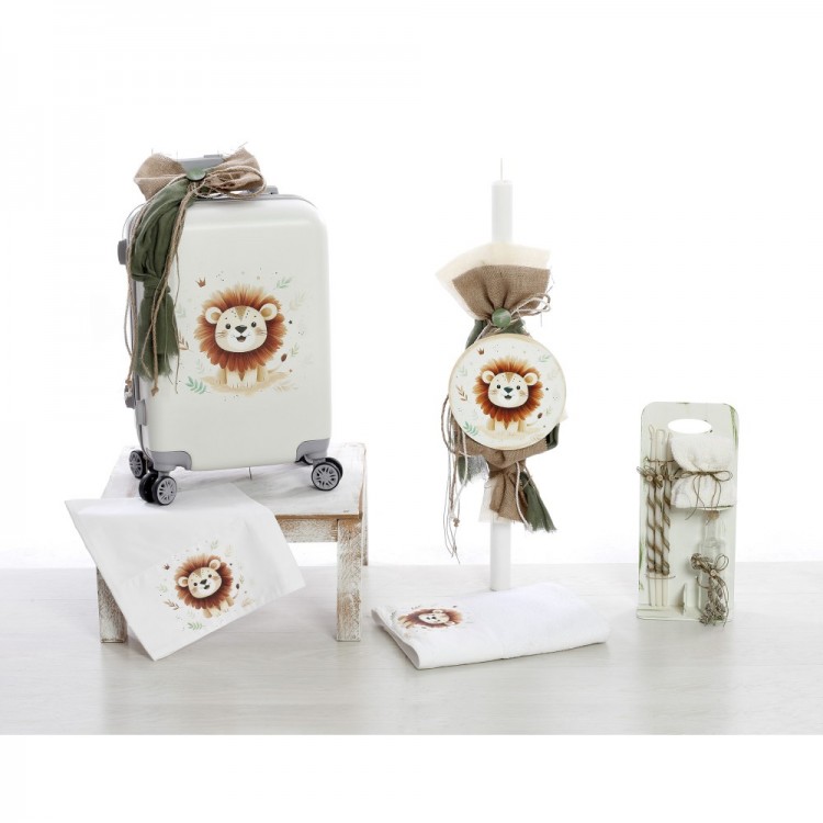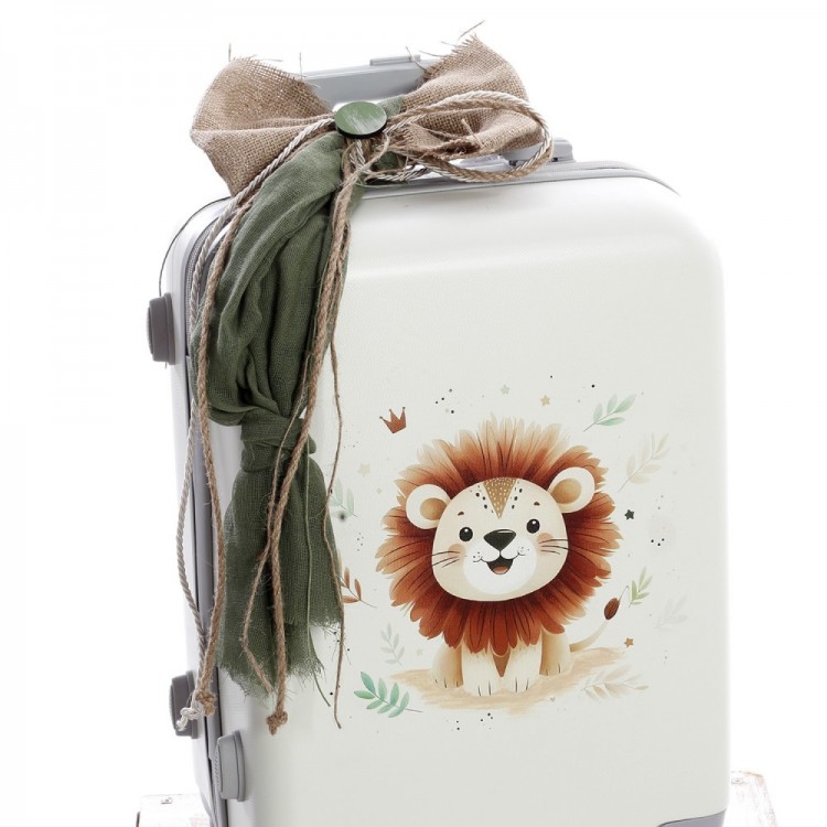 ✔ Βαλίτσα τροχήλατη με εκτύπωση UV λιονταριού, διακοσμημένη με υφασμάτινες κορδέλες & λινά στοιχεία. (Διαστάσεις: 57cm x 40cm x 22cm)