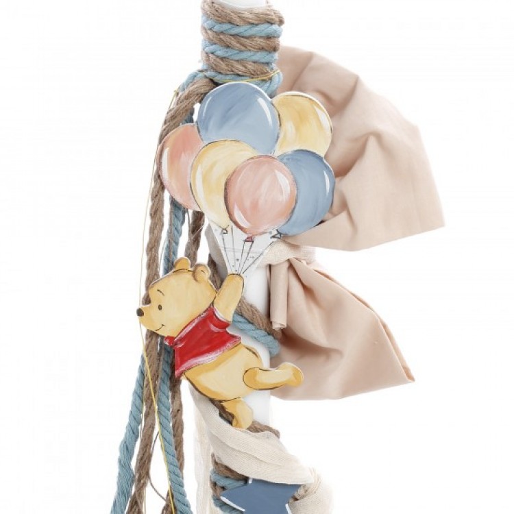 ✔ Λαμπάδα βάπτισης, διακοσμημένη με ξύλινο διακοσμητικό Winnie the Pooh, υφασμάτινα μπαλόνια, φυσικά σχοινιά και κορδέλες.