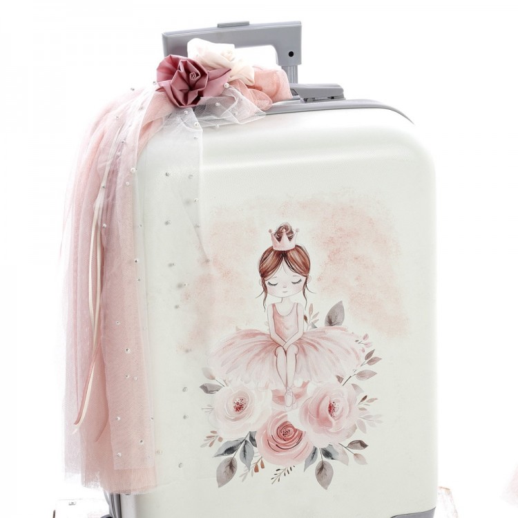 ✔ Βαλίτσα τροχήλατη με UV εκτύπωση κομψής μπαλαρίνας, διακοσμημένη με τούλια, κορδέλες και υφασμάτινα λουλούδια. (Διαστάσεις: 57cm x 40cm x 22cm)