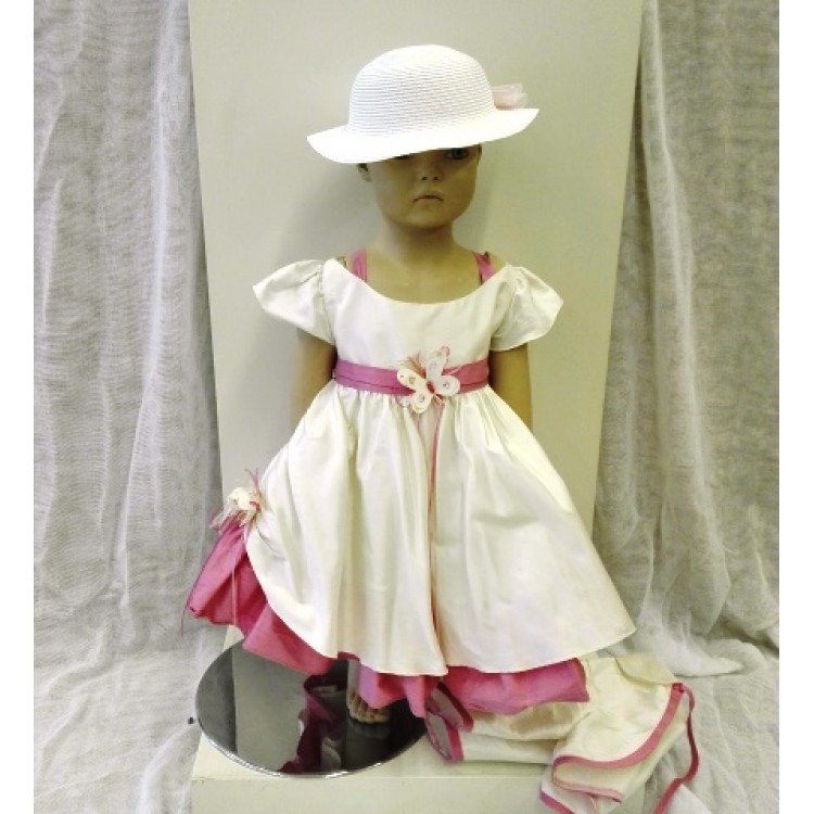 Φόρεμα Βάπτισης μπέζ-φούξια, από μεταξωτό ταφτά με 3D πεταλούδα και ασορτί καπέλο.