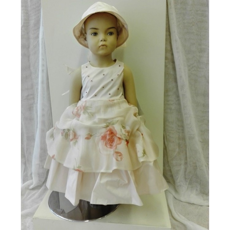 Φόρεμα ρόζ ταφτάς, με ζωγραφισμένα λουλούδια και ασορτί καπέλο.