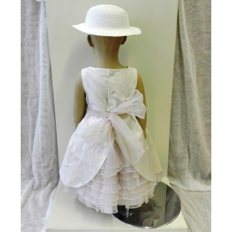 Φόρεμα ζαχαρί, από μεταξωτό ταφτά με διακοσμητικά τούλια στο πίσω μέρος και ασορτί καπέλο.