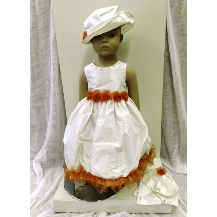 Φόρεμα Βάπτισης λευκό μπαλούν, με πορτοκαλί λουλούδια και ασορτί καπέλο.
