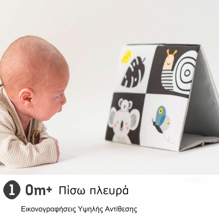 Ο καθρέφτης καλύπτεται από τα πτερύγια του βιβλίου που μπορούν να χρησιμοποιηθούν για ένα υπέροχο παιχνίδι εμφάνισης -απόκρυψης μεταξύ γονέα και μωρού. Τρύπες σε σχήμα αστεριού στα πτερύγια που καλύπτουν τον καθρέφτη αστράφτουν και τραβούν την προσοχή του μωρού. Μπορεί να χρησιμοποιηθεί σε 3 διαφορετικές θέσεις: στην κοιλιά, ή σε καθιστή θέση ενώ βρίσκεστε στο καρότσι ή όταν ταξιδεύετε με αυτοκίνητο! Ελαφρύ και εύκολο στην αναδίπλωση. Κατασκευασμένο από υψηλής ποιότητας μη τοξικά υλικά, χωρίς BPA, χωρίς PVC, χωρίς φθαλικές ενώσεις.