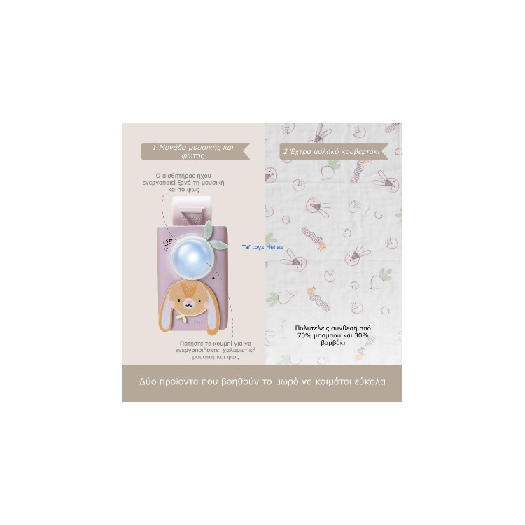 Το σετ μας, αποτελείται από μια μονάδα με αισθητήρα ήχου που ενεργοποιείται με το κλάμα του μωρού και ένα κορυφαίας ποιότητας βρεφικό κουβερτάκι κατασκευασμένο από ένα πολυτελές μείγμα από 70% μπαμπού και 30% βαμβάκι, προσφέροντας μια ανακουφιστική και χαλαρωτική εμπειρία για το μωρό σας, ειδικά για την ώρα του ύπνου.